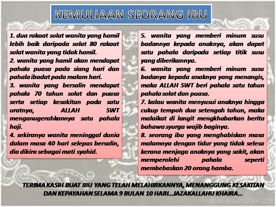 2. wanita yang hamil akan mendapat pahala puasa pada siang hari dan pahala ibadat pada malam hari.